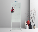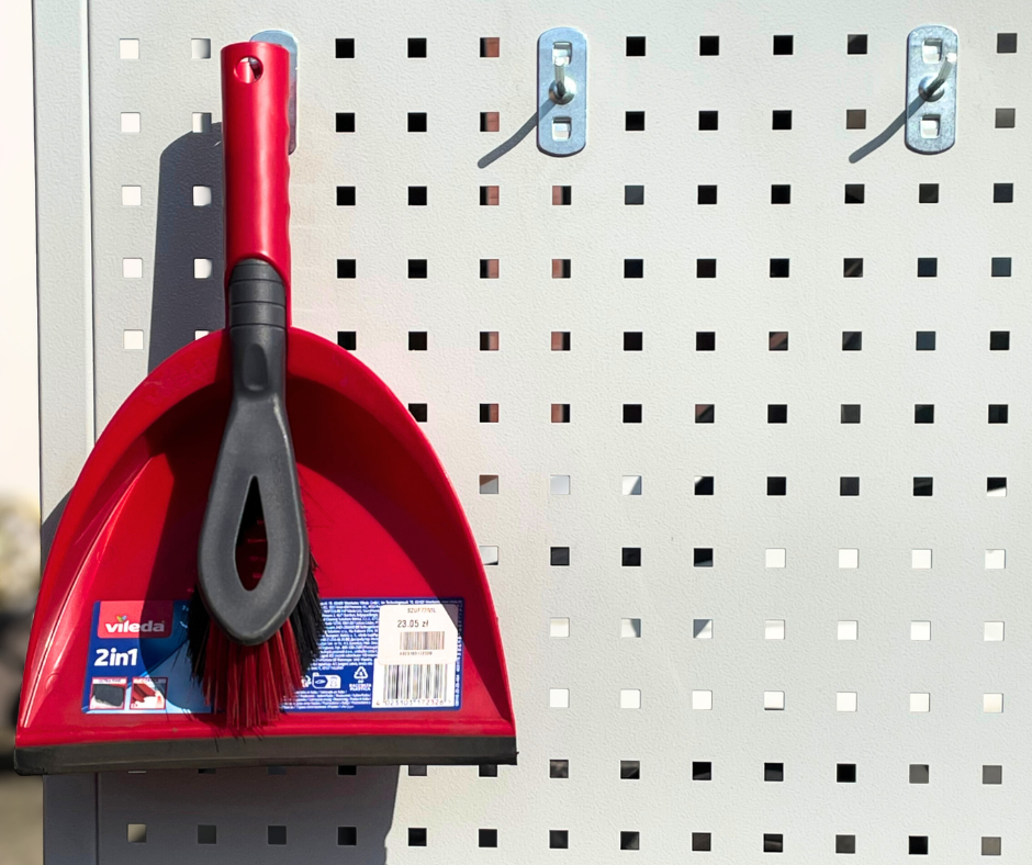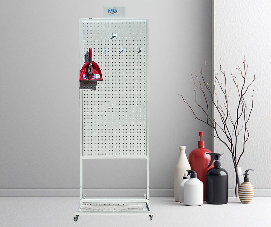 Regał „Kącik Czystości” o wymiarach 224 × 75 cm to funkcjonalne i estetyczne rozwiązanie do przechowywania akcesoriów do sprzątania. Konstrukcja wyposażona jest w praktyczne haczyki oraz mobilną podstawę na kółkach, dzięki czemu umożliwia wygodne organizowanie narzędzi takich jak miotły, szczotki czy szufelki. Perforowana tablica pozwala na elastyczne rozmieszczenie uchwytów, co ułatwia utrzymanie porządku w przestrzeni roboczej. Regał idealnie sprawdzi się w magazynach, sklepach, pomieszczeniach gospodarczych oraz zapleczach sanitarnych.